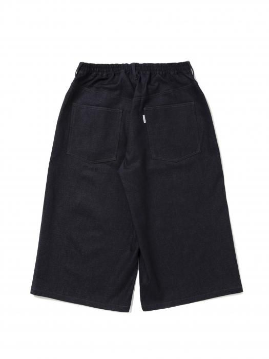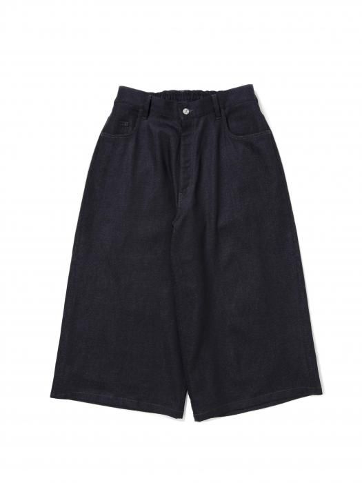 経糸、緯糸を通常のデニムの糸使いでドビー織機によって織り上げたオリジナルファブリックをリジッドで使用。裏糸はループ調でふんわりとしたタッチを持つ。バックゴムイージー仕様。前開き有り。8分丈のワイドシルエット。
