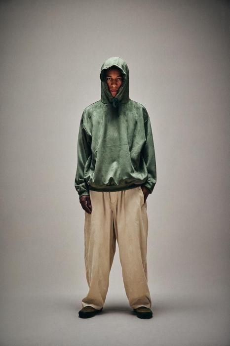 スエード調の質感が特徴的な生地を使用したプルオーバーフーディ。