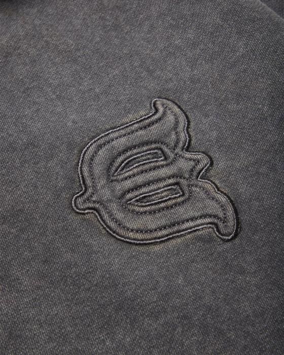 左胸にEロゴのスウェットパッチ、フロントにカンガルーポケットを配置。